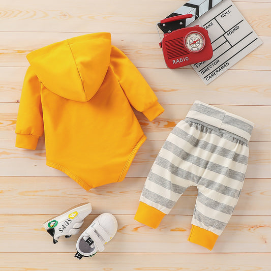 2pcs Solid Long-sleeve Hooded Romper and Stripe Trouser Baby Set