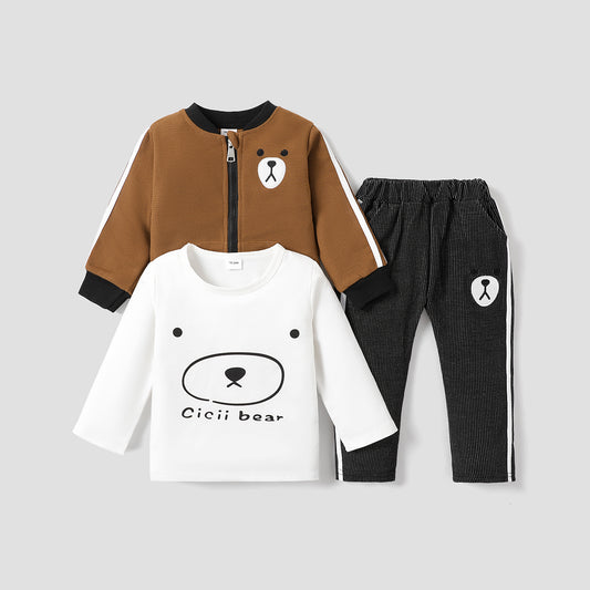 3-piece Toddler Boy Letter Bear Print White Long-sleeve T-shirt, Bomber Jacket and Elasticized Pants Set